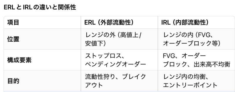 SMCにおけるERL(External Range Liquidity)とIRL(Internal Range Liquidity)とは機関投資家(スマートマネー)の動きを基にした市場分析手法で、ERLとIRLは価格が引き寄せられる「流動性(Liquidity)」のエリアを特定する重要な概念です。