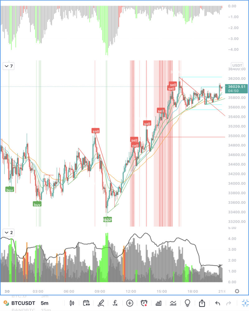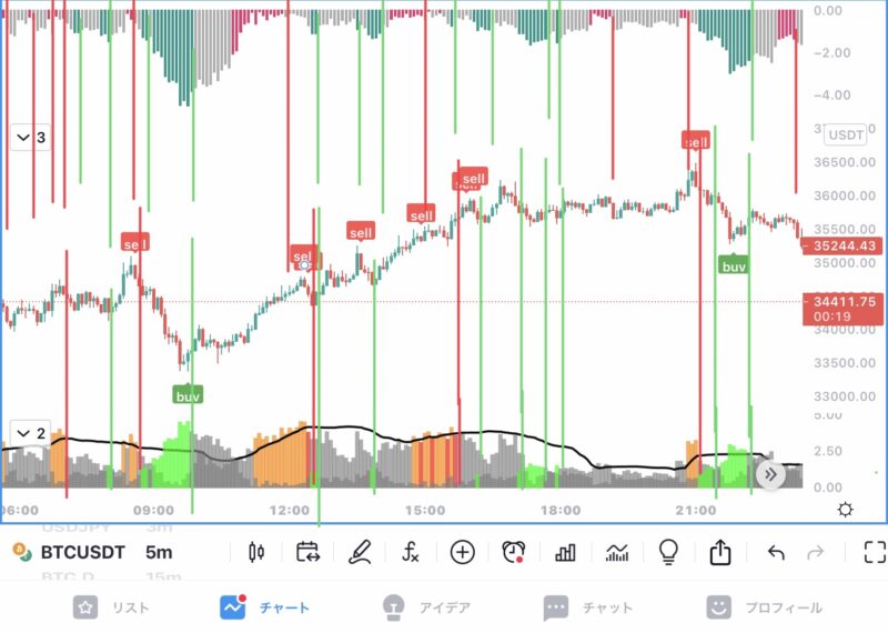 インジケーターが緑(買い)の後に緑の縦線、オレンジもしくは赤(売り)の後に赤の縦線を引いてあります。
