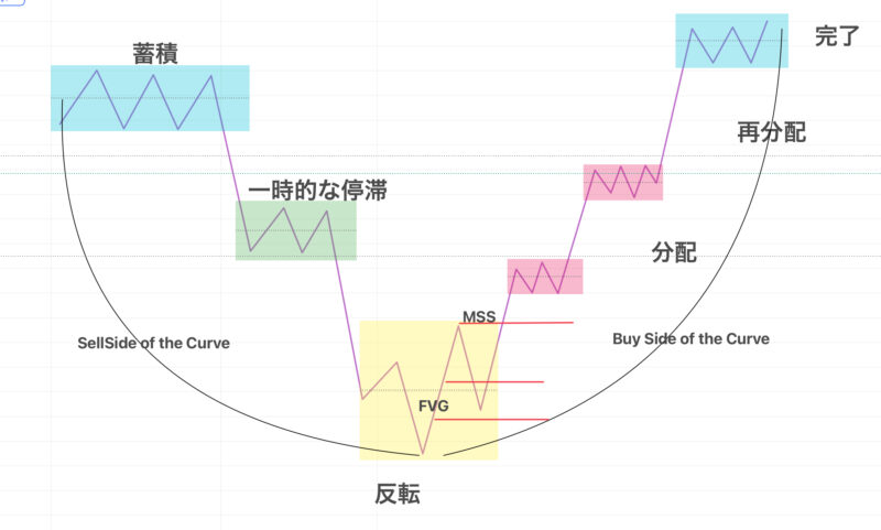 画像ではSellSideのOBとなるあたりで蓄積をした後に分配、再蓄積、再分配となります。
