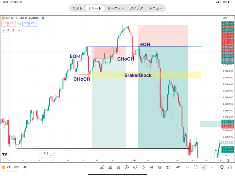 CHoCHやBoSに関してはまた詳しく書きますが、簡単に言うと上昇トレンドでの安値切り上げの失敗や、下降トレンドでの高値切り下げの失敗です。