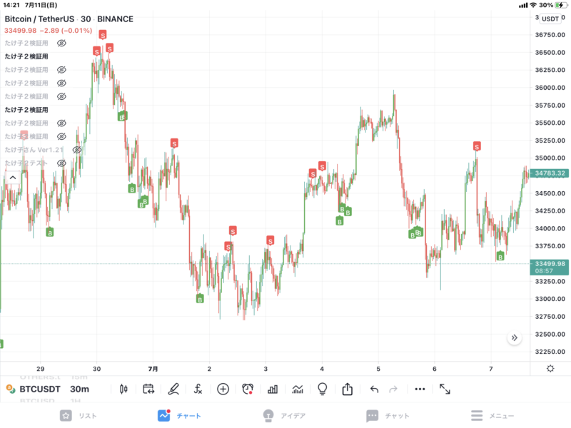 今回はBTCの30分足でチャートを表示しましたが、8Hなどの上位足で見る時は②や④も表示させてサイン数を増やしてください。