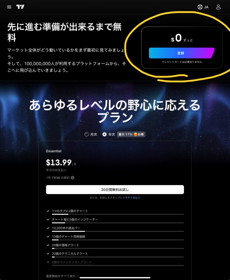 使い方に慣れてきて、多画面表示やインジケーターの追加などをしたい場合は課金が必要です。