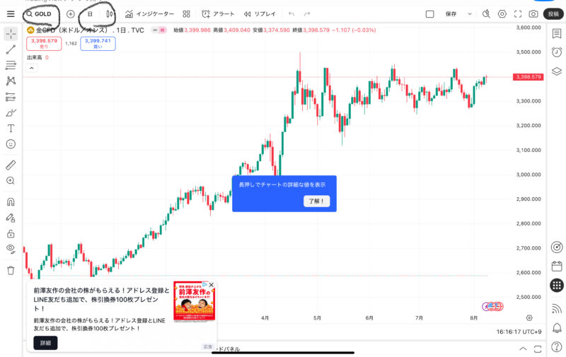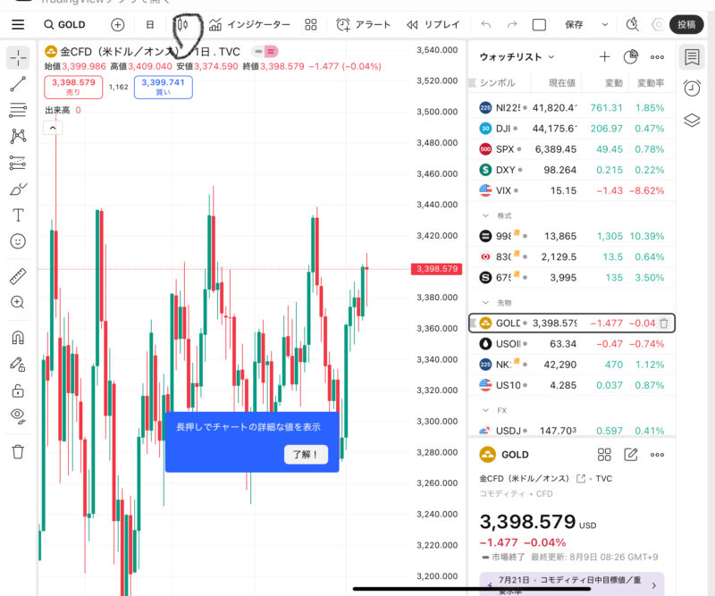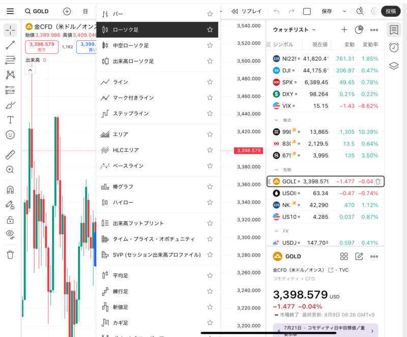 ローソク足/ラインチャート/バーチャートなど、好みで切り替え可能です。