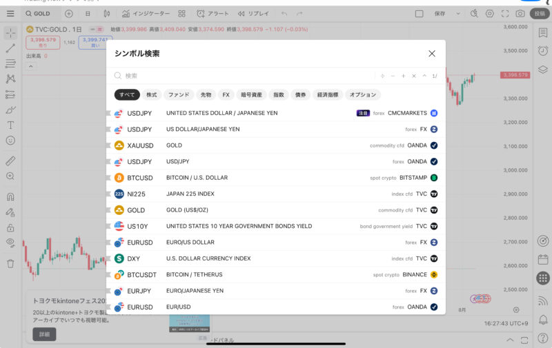 画面上部の検索バーに「USDJPY」や「BTCUSD」、「XAUUSD(金)」などを入力。