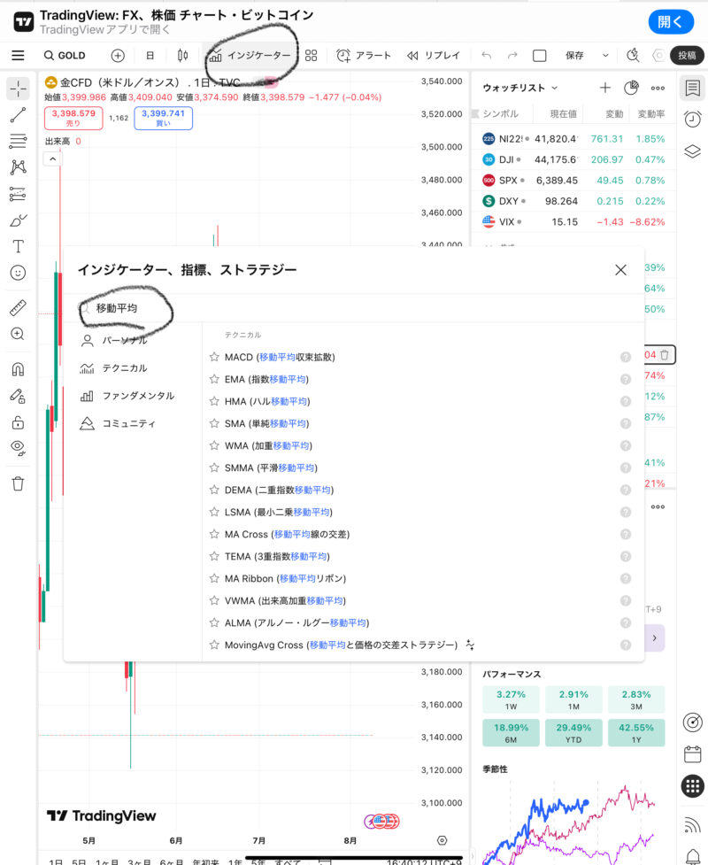 検索窓に「Moving Average(移動平均)」や「RSI」「MACD」などを入力。