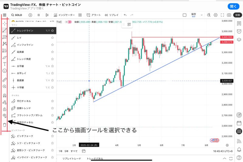 チャート左側(スマホは下側)のツールバーに「トレンドライン」「水平線」「四角」「テキスト」など豊富な描画ツールがあります。